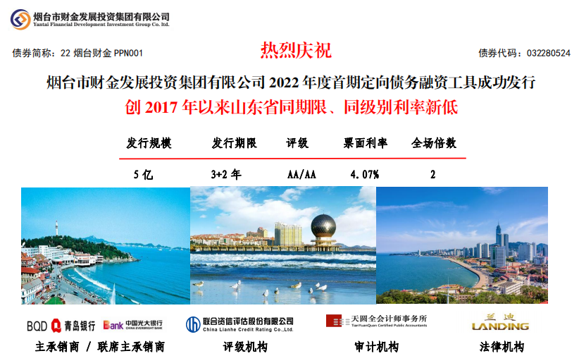 6月8日,煙臺(tái)財(cái)金集團(tuán)2022年度首期定向債務(wù)融資工具(PPN)在中國(guó)銀行間市場(chǎng)交易商協(xié)會(huì)成功發(fā)行!發(fā)行規(guī)模5億元,期限3+2年,票面利率4.07%,全場(chǎng)認(rèn)購(gòu)倍數(shù)2倍,創(chuàng)2017年以來(lái)山東省同期限、同級(jí)別利率新低。本期債券發(fā)行由青島銀行牽頭主承,光大銀行聯(lián)席主承,聯(lián)合資信、天圓全會(huì)計(jì)師事務(wù)所及蘭迪律師事務(wù)所分別提供信用評(píng)級(jí)、審計(jì)和法律服務(wù)。