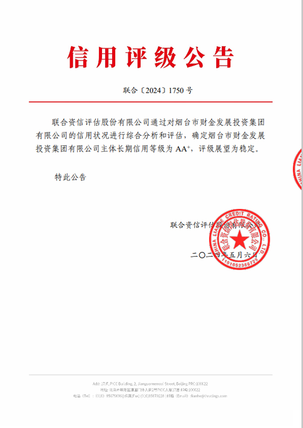5月6日,經(jīng)國內(nèi)專業(yè)評級機(jī)構(gòu)聯(lián)合資信評估股份有限公司綜合分析評定,煙臺財金集團(tuán)主體信用評級成功由“AA”上調(diào)至“AA+”,評級展望為“穩(wěn)定”。