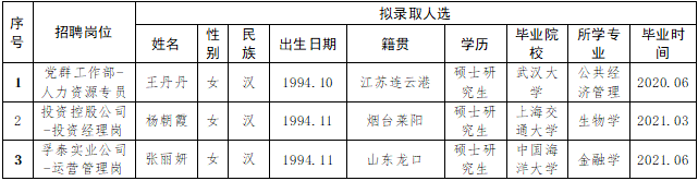 按照2020年8月28日發(fā)布的《2020年煙臺財(cái)金集團(tuán)面向“雙一流”和全球TOP200高校畢業(yè)生公開招聘簡章》相關(guān)規(guī)定,經(jīng)過簡歷收集、資格審查、初試、復(fù)試、集體決策等環(huán)節(jié),擬確定部分崗位錄取人選(詳見下表),現(xiàn)予以公示,公示期為5個工作日(11月10日至11月17日)。